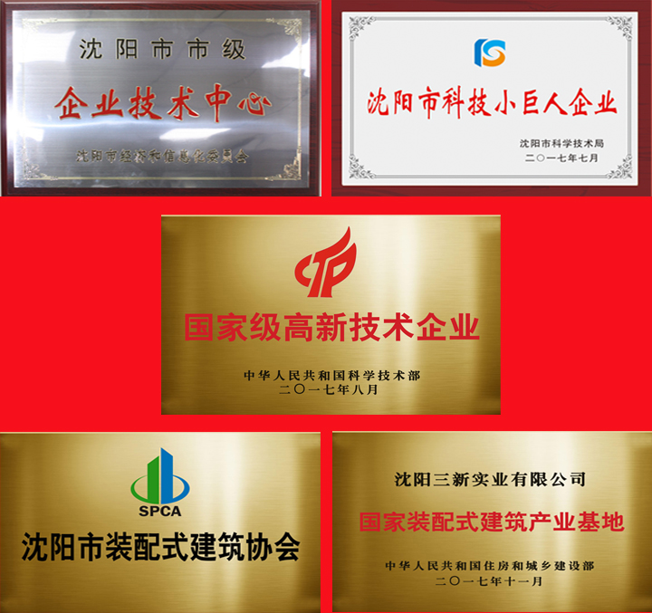 春華秋實,2017年是三新集團豐收的一年,借力國家創(chuàng)新戰(zhàn)略的成功實施,集團業(yè)務長足發(fā)展,實力與日俱增。集團相繼獲得國家科技部授予的“高新技術企業(yè)”、沈陽市高新技術和科技小巨人“雙培育”企業(yè)、“國家裝配式建筑產業(yè)基地”和“全國科技低碳鋼結構產業(yè)示范基地”、沈陽市“重合同守信譽”單位。三新集團的技術研發(fā)中心被評為市級企業(yè)技術中心。三新集團產品被列入《遼寧省重點推廣應用工業(yè)產品目錄(2017年版)》、沈陽市重點工業(yè)優(yōu)質產品名錄。