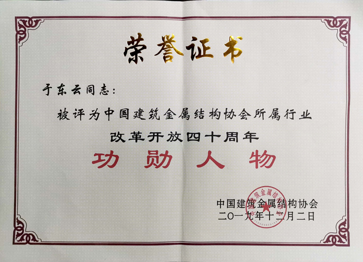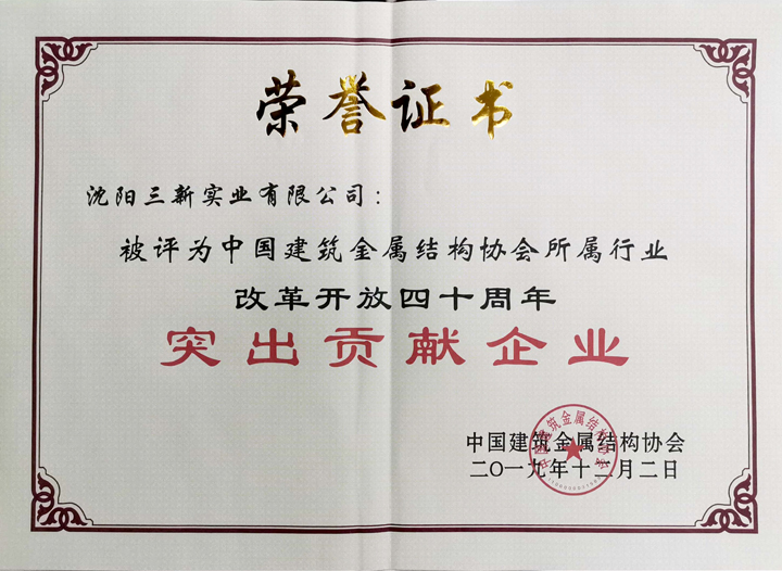 三新集團(tuán)于東云董事長榮獲“中國建筑金屬結(jié)構(gòu)協(xié)會(huì)所屬行業(yè)改革開放四十年突出功勛人物”稱號,三新集團(tuán)榮獲“中國建筑金屬結(jié)構(gòu)協(xié)會(huì)所屬行業(yè)改革開放四十年突出貢獻(xiàn)企業(yè)”稱號。于東云董事長被選為中國建筑金屬結(jié)構(gòu)協(xié)會(huì)第十一屆理事會(huì)名譽(yù)副會(huì)長。