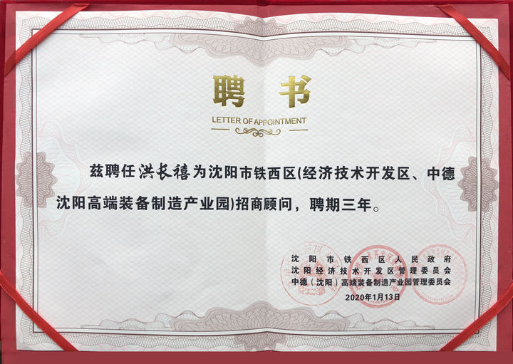 日前,我公司洪長禧總經(jīng)理被聘任為沈陽市鐵西區(qū)(經(jīng)濟(jì)技術(shù)開發(fā)區(qū)、中德沈陽高端裝備制造產(chǎn)業(yè)園)招商顧問。自從入駐沈陽以來,不忘初心、不辱使命,勇于創(chuàng)新,多年來為經(jīng)濟(jì)技術(shù)開發(fā)區(qū)、鐵西經(jīng)濟(jì)社會實現(xiàn)高質(zhì)量發(fā)展,為鐵西區(qū)老工業(yè)基地全面振興做出了應(yīng)有的貢獻(xiàn)!尤其是積極參與謀劃中德沈陽高端裝備制造產(chǎn)業(yè)園的發(fā)展,并成為入駐園區(qū)龍頭企業(yè)。相信隨著產(chǎn)業(yè)園的蓬勃發(fā)展,我公司會如虎添翼,更上一層樓!