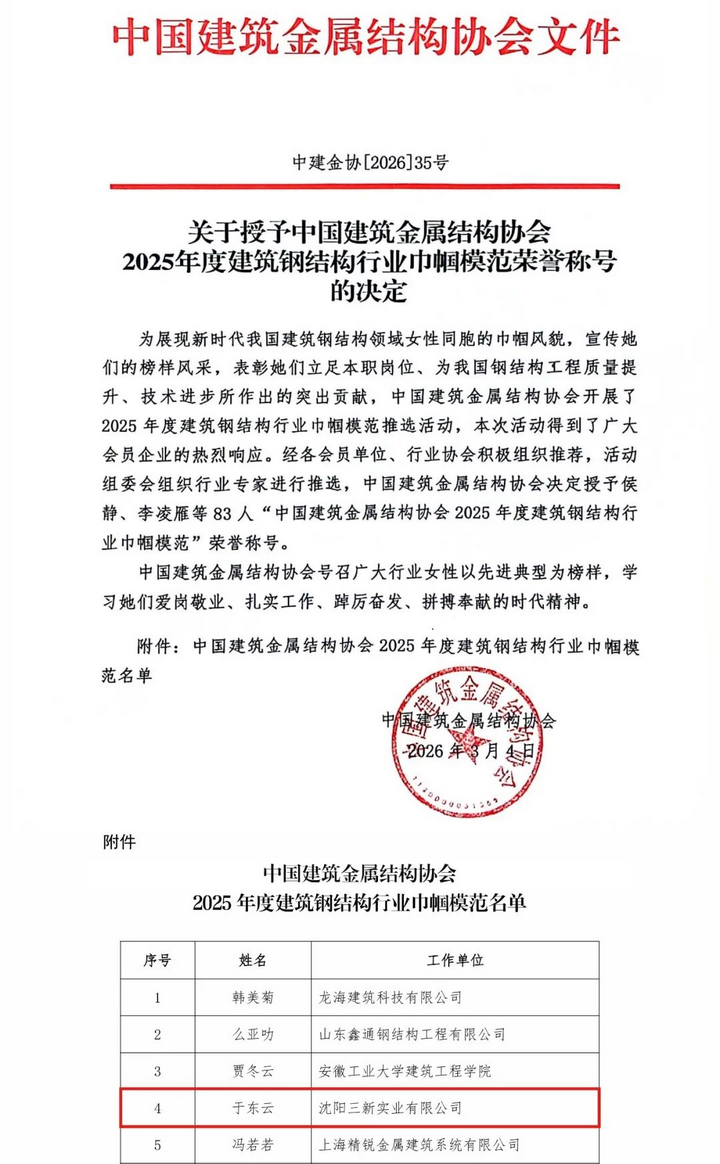 三月春風(fēng)拂面,巾幗芳華綻放。近日,中國建筑金屬結(jié)構(gòu)協(xié)會發(fā)布中建金協(xié)[2026]35號文件,授予全國83位行業(yè)女性“2025年度建筑鋼結(jié)構(gòu)行業(yè)巾幗模范”榮譽(yù)稱號,沈陽三新實(shí)業(yè)有限公司董事長于東云位列其中。在第116個“三八”國際勞動婦女節(jié)來臨之際,這份國家級榮譽(yù),是行業(yè)贈予她的節(jié)日厚禮,是對她深耕建筑鋼結(jié)構(gòu)領(lǐng)域多年的匠心堅(jiān)守與卓越貢獻(xiàn)的權(quán)威認(rèn)可,更是對新時代女性企業(yè)家剛?cè)岵?jì)、勇立潮頭的最美褒獎。
