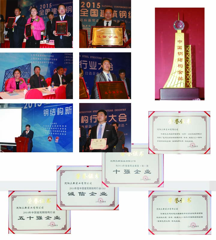 本屆大會是表彰盛會,它被譽為鋼結構行業(yè)的“東方奧斯卡盛典”共有十二個獎項在此頒發(fā)。三新集團董事長兼遼寧省建筑金屬結構協(xié)會會長于東云率團參加了本次大會,并做了主旨演講。公司工程部高剛部長在“鋼結構新技術、新產(chǎn)品交流會”上介紹并展示了公司的新技術新產(chǎn)品。公司承建的中國有色(沈陽)冶金機械新廠區(qū)建設項目、中鋁集團東北輕合金有限責任公司超大規(guī)模特種鋁合金板帶材項目及優(yōu)化特種鋁合金板帶材產(chǎn)品結構配套項目分獲第十一屆第二批“中國鋼結構金獎”。同時公司還獲得2014年度“中國建筑鋼結構誠信企業(yè)(5A)”企業(yè)、“2014年度全國鋼結構行業(yè)50強企業(yè)”、“2014年度金屬屋墻面行業(yè)十強企業(yè)” 稱號,于東云董事長榮獲“2014年度全國鋼結構行業(yè)優(yōu)秀企業(yè)家” 稱號、王國臣榮獲 “2014年度全國鋼結構行業(yè)優(yōu)秀車間主任”稱號、吳龍榮獲“2014年度行業(yè)協(xié)會優(yōu)秀工作者” 稱號。公司還派團參加了“2015年鋼結構龍頭企業(yè)業(yè)績及配套產(chǎn)品展覽會”,公司及產(chǎn)品得到參會客商的良好評價。